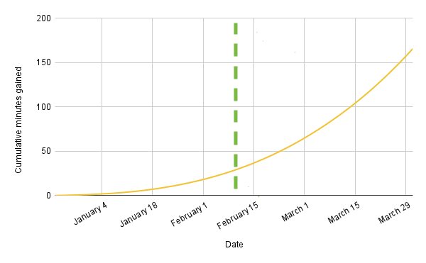 This is a chart (I spend a fair bit of time in google spreadsheets these days ) showing the cumulative number of minutes of daylight we gain each day. We don’t make up much for the next month—we’re still in the dark. This means you still have permission to rest, hang out by a fire, read a book, watch a movie, do nothing!
